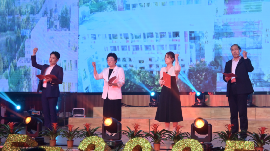 朗诵《奠基者的心声》由4名教师代表倾情演绎。老师们以庄重深情的语言,结合简单走位与情景互动,真实还原了学校初创时期的艰辛与坚守。舞台背景同步播放着黑白老照片,手写体文字缓缓浮现,引发老一辈师生与校友的深切共鸣。
