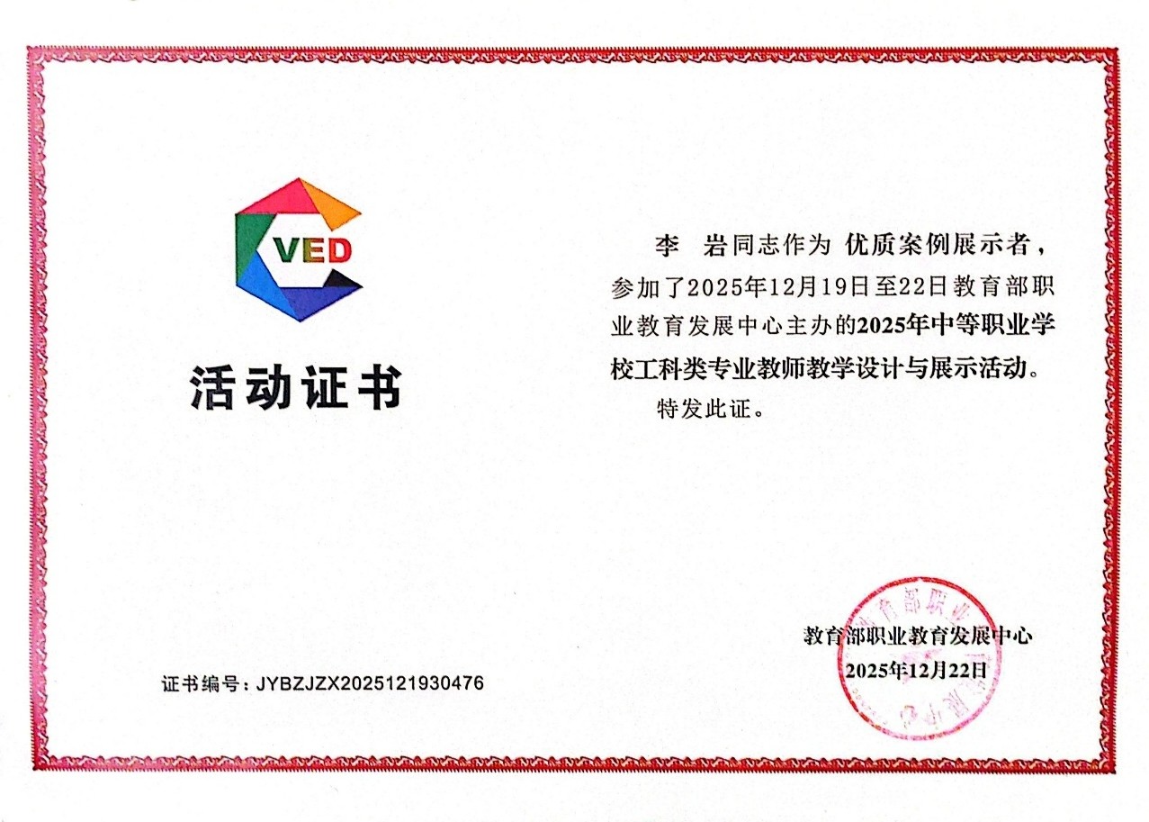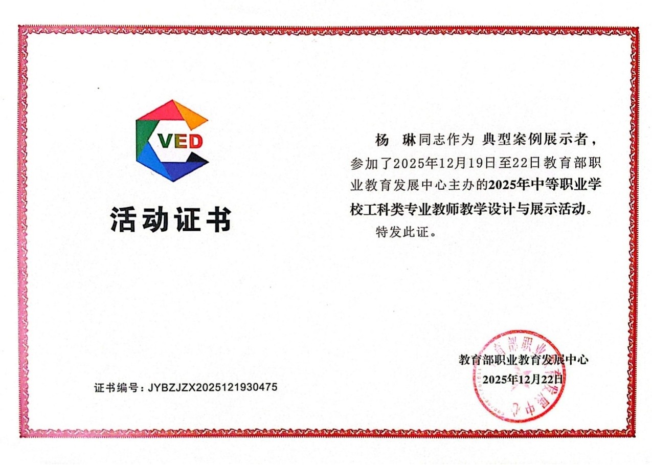 12月19日至22日,教育部职业教育发展中心主办的“2025年中等职业学校工科类专业教师教学设计与展示活动”在福州市举行。本次赛事汇集了来自全国27个省(自治区、直辖市)的94名建筑类优秀教师同台竞技,竞争激烈。我校建筑专业部教师杨琳和李岩凭借扎实的专业功底与创新的教学设计,在强手中脱颖而出,斩获佳绩:杨琳老师荣获“典型案例展示者(一等奖)”,李岩老师荣获“优秀案例展示者(二等奖)。